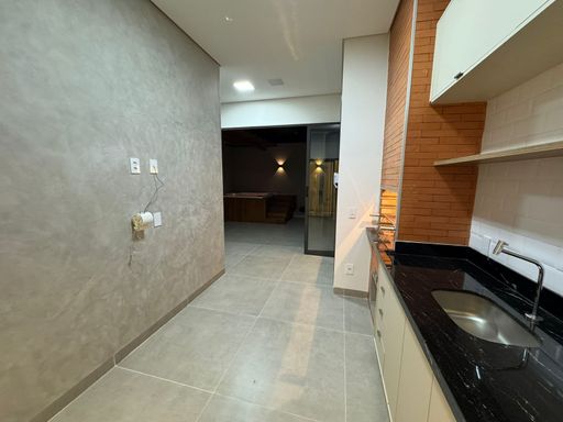 • Living integrado com sala de TV, jantar e cozinha planejada em conceito aberto